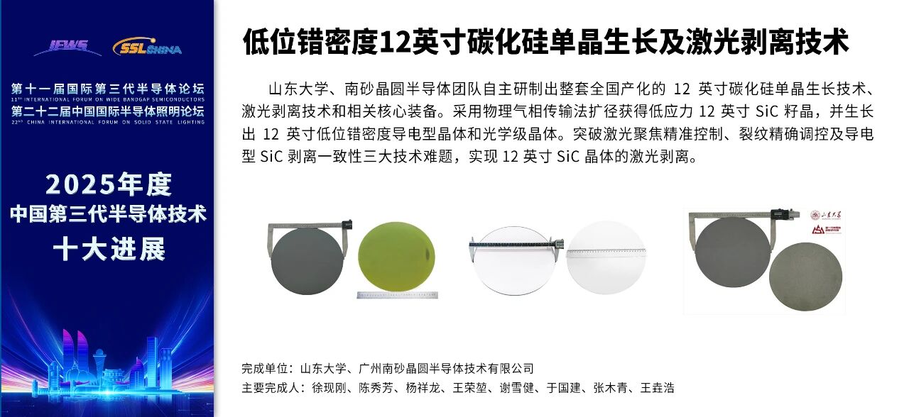 “低位错密度12英寸碳化硅单晶生长及激光剥离技术”入选“2025年度中国第三代半导体技术十大进展”。
