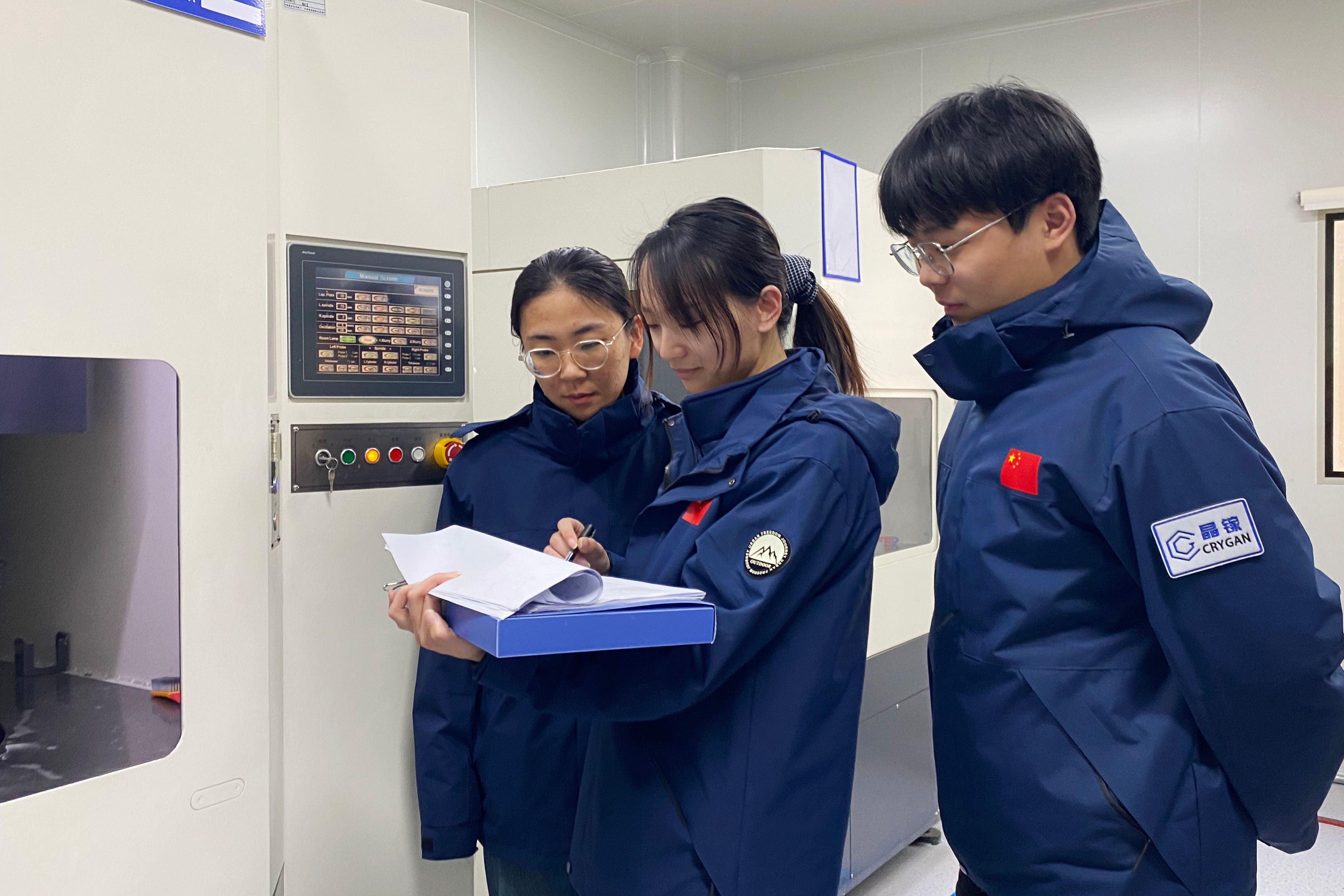 图:氮化物团队李秋波博士(左二)与团队在晶镓产业化产线上持续奋战